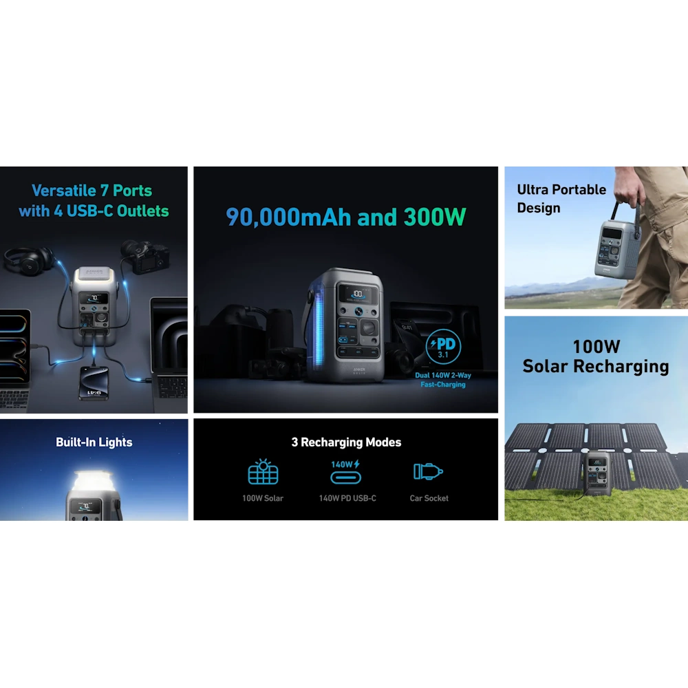 - This 90,000mAh (288Wh) battery delivers 300W and includes two 140W two-way USB-C fast charging ports.