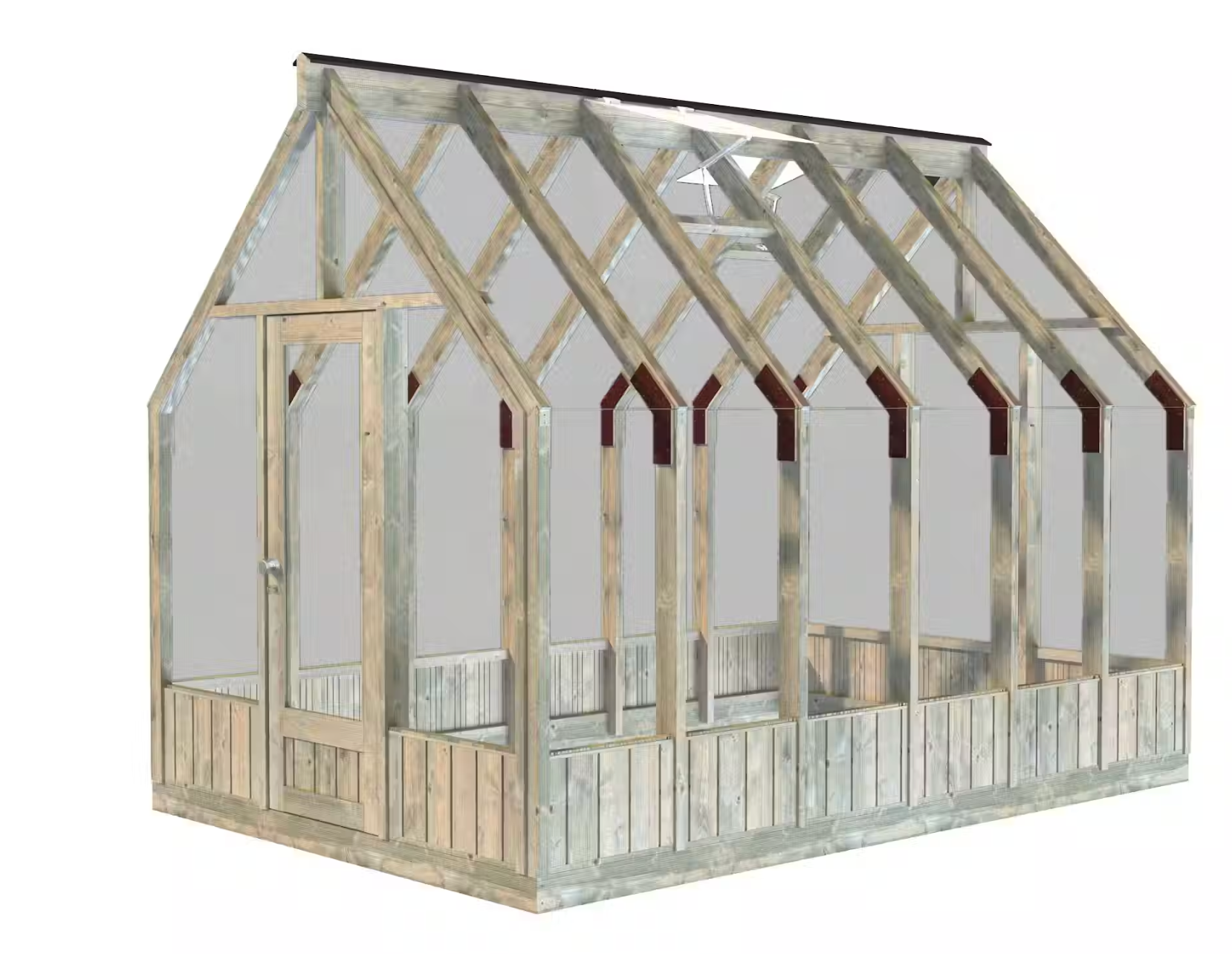 The glasshouse's grey-wash Nordic Spruce frame comes pressure-treated for longevity with impra®lit-KDS - a water-borne, chromium free wood preservative (copper-organics) for the prevention of attack by insects including termites, soft rot and fungal decay.