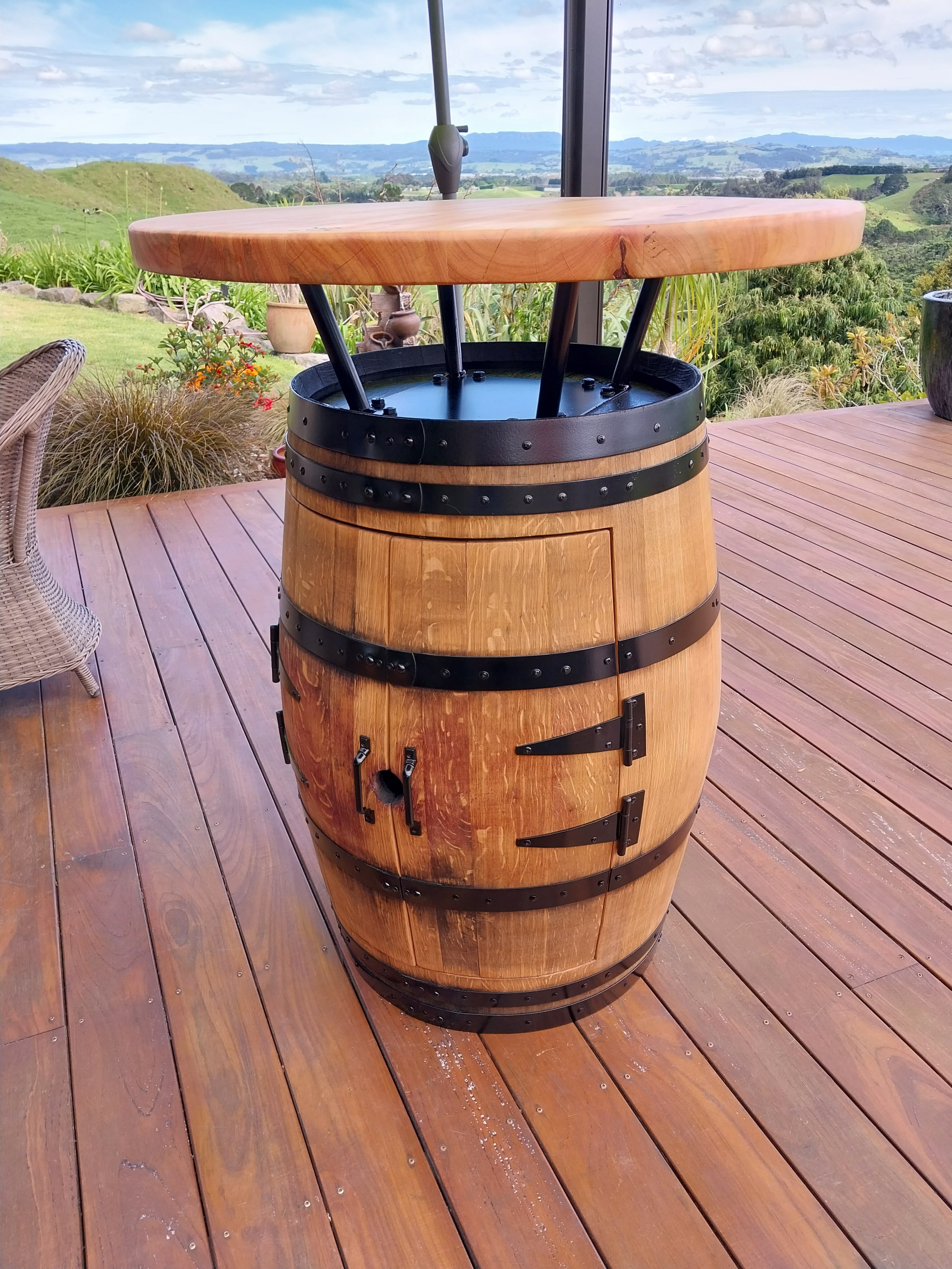 The cabinet is made from a full oak retired wine barrel and has a shelf that will store everything from your favourite liquor to all your special glassware.