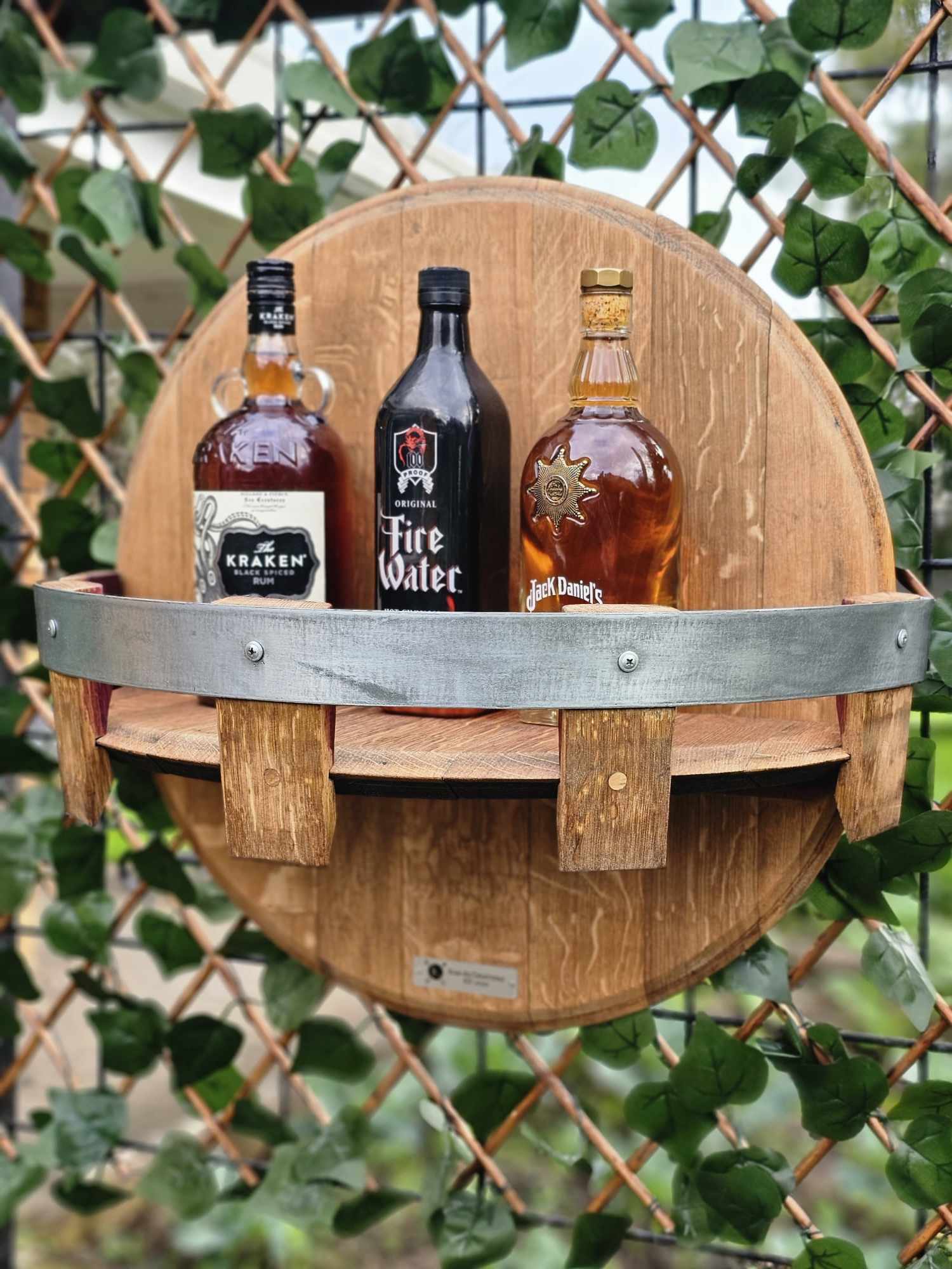 This will hold up to at least six liquor bottles depending on the size of the bottles or can also be used as a plant holder etc if you wish. Our shelves are hand crafted from retired oak barrel staves and the steel barrel ring, easy to hang with 2 x sturdy hooks.