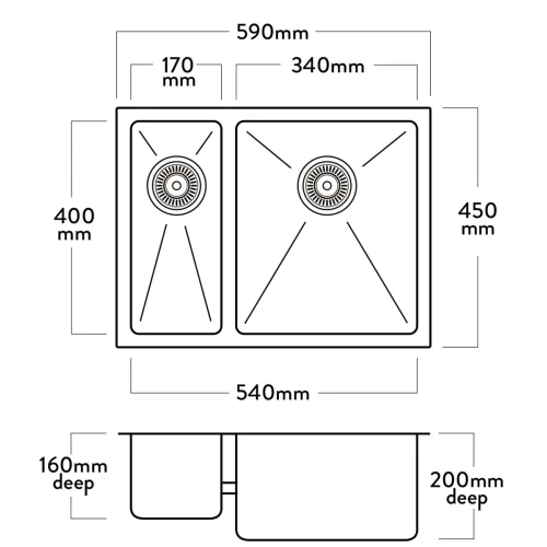 The DV Brighton 1 & ¼ double bowl sink has a 15mm corner radius and comes standard with a 90mm round basket waste, sound deadening and 15l/m overflow.