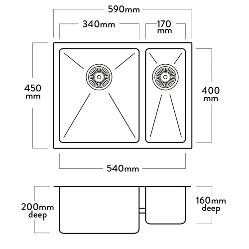 The DV Brighton 1 & ¼ double bowl sink has a 15mm corner radius and comes standard with a 90mm round basket waste, sound deadening and 15l/m overflow.