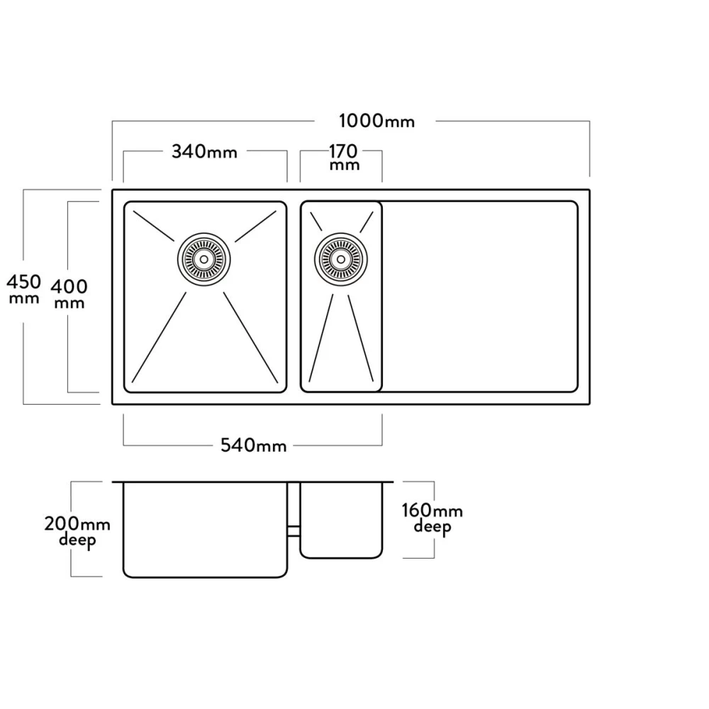 The DV Salisbury 1 & 1/4 double bowl and drainer has a 15mm corner radius and comes standard with a 90mm round basket waste, sound deadening and 15l/m overflow.