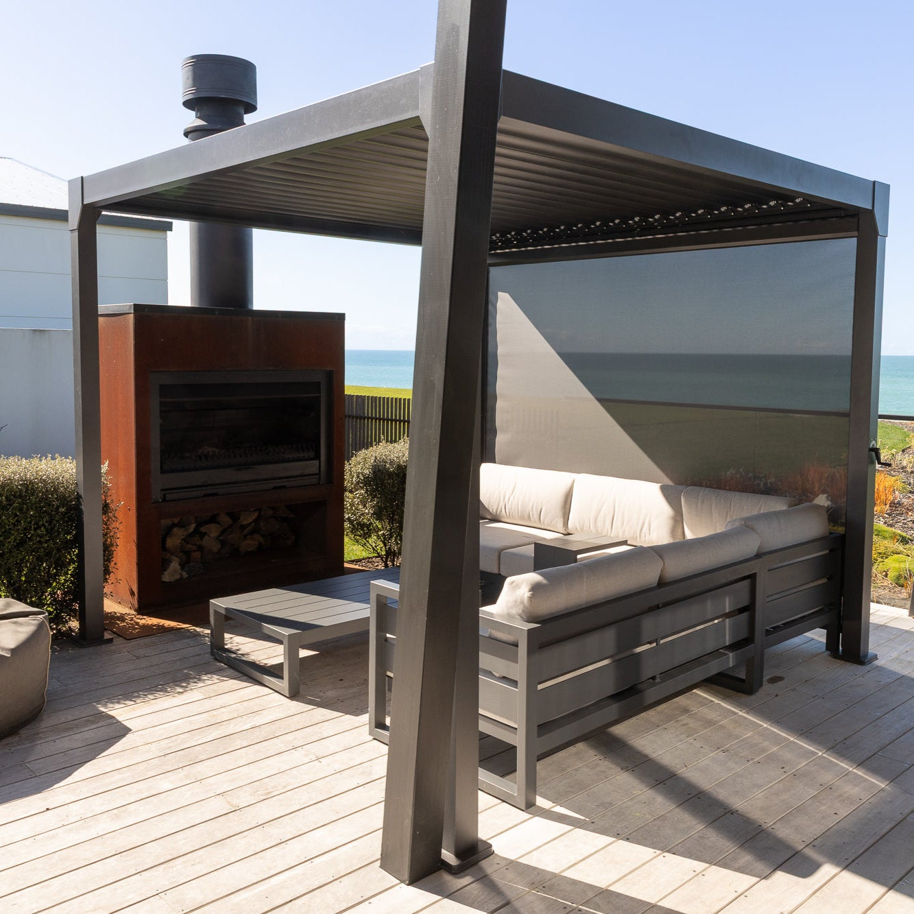 Unlike bulky outdoor blinds, the sleek pull-down shade is fully integrated with your Sereno Louvre Roof system. Its smooth, reliable operation lets you adapt your space in seconds, making it ideal for everything from sunny afternoons in Hawke’s Bay to blustery evenings on the coast.
