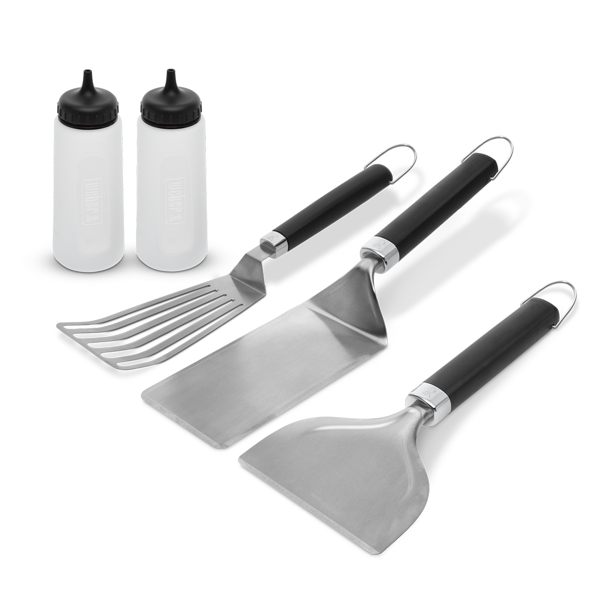 Here’s your 5-piece set for griddle success. These essentials are designed to help you create delicious pancakes, fajitas, paninis and more, and make clean up a cinch. Includes: Griddle Spatula, Flexible Griddle Spatula, Griddle Scraper and Griddle Squeeze Bottles (2).