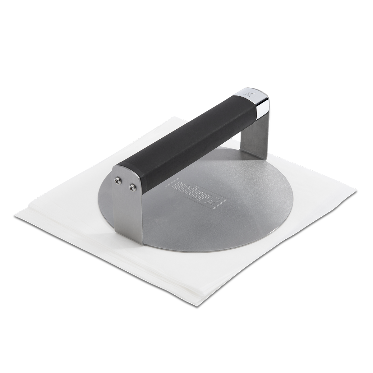 • For a clean release, place custom-sized patty paper between the burger and the Smashed Burger Press