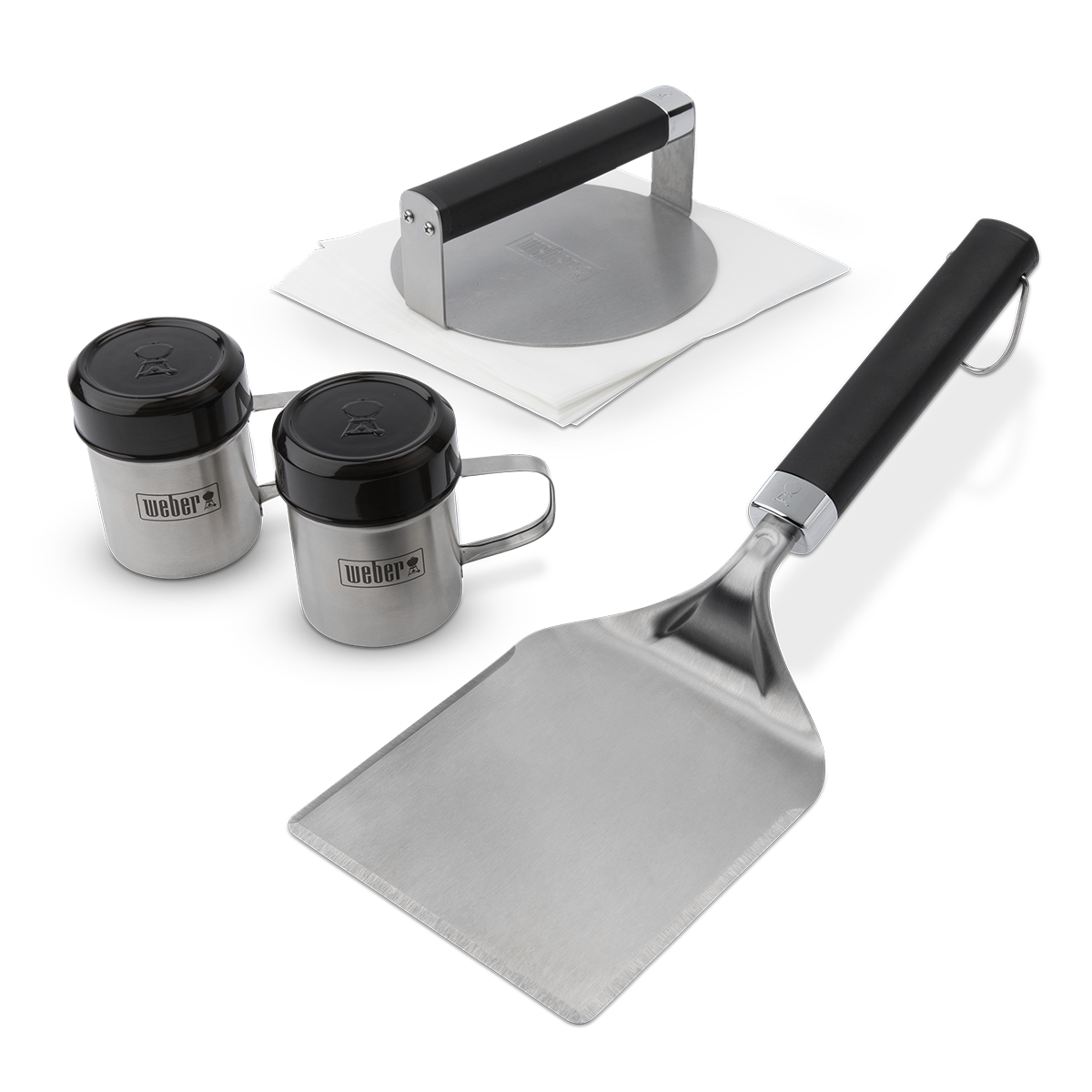 • Smashed Burger Press, patty paper, wide spatula, and two seasoning shakers