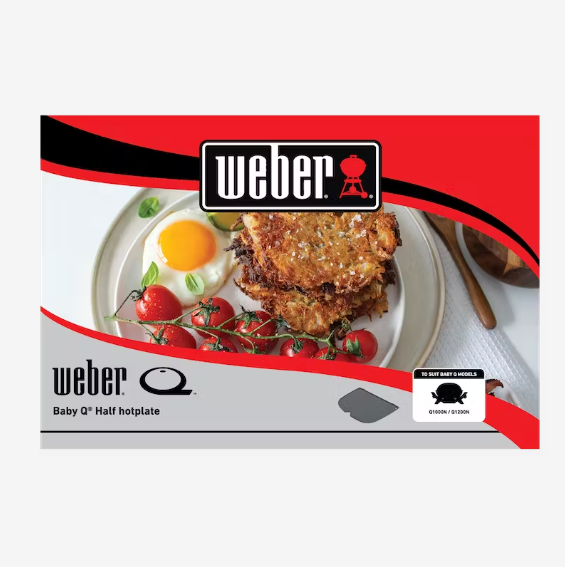 Creating delicious meals on your Weber Baby Q has never been so easy. The Baby Q half hotplate allows you to simultaneously grill and fry, and is perfect for eggs, smashed burgers, pancakes and fried onions.The porcelain-enamelled cast-iron BBQ hotplate helps maintain even edge-to-edge heat and prevents sticking to the surface.