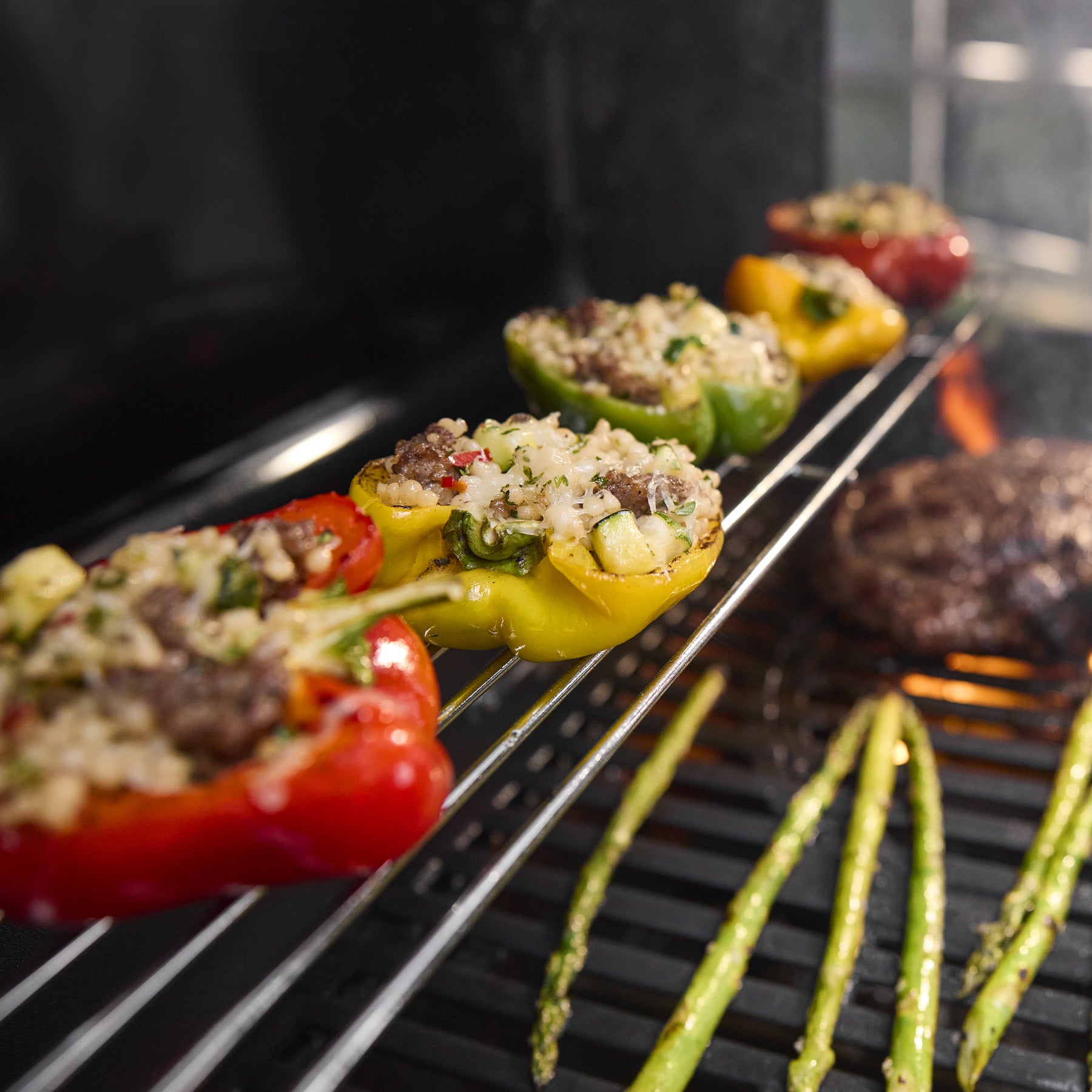 Warming rack keeps food warm or toasts buns while you finish cooking below